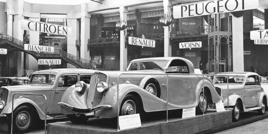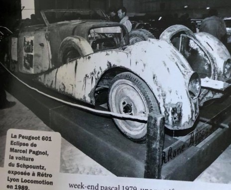 En collaboration avec le carrossier Marcel Pourtout (sur la photo, à côté de son œuvre) et le concessionnaire Peugeot parisien Emile Darl’Mat (1892 – 1970), la première Peugeot « Eclipse » fut construite sur un châssis Peugeot 301 et présentée au public lors du Salon de l’Automobile de 1933.