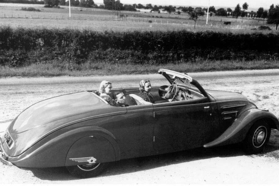 Peugeot 402 Eclipse E5T, ab 1938 mit Reserverad außen am Kofferraum und großem Motor (anstatt 2,0l einen 2,2l Motor mit 63 PS).